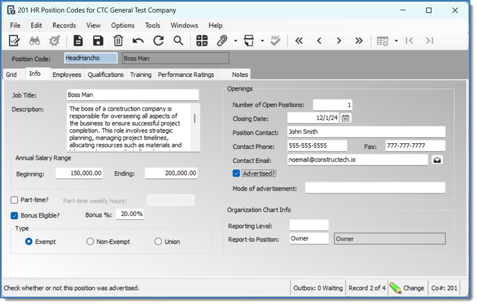 HR Position Codes in Vista, you can define roles and their required training, as shown below: