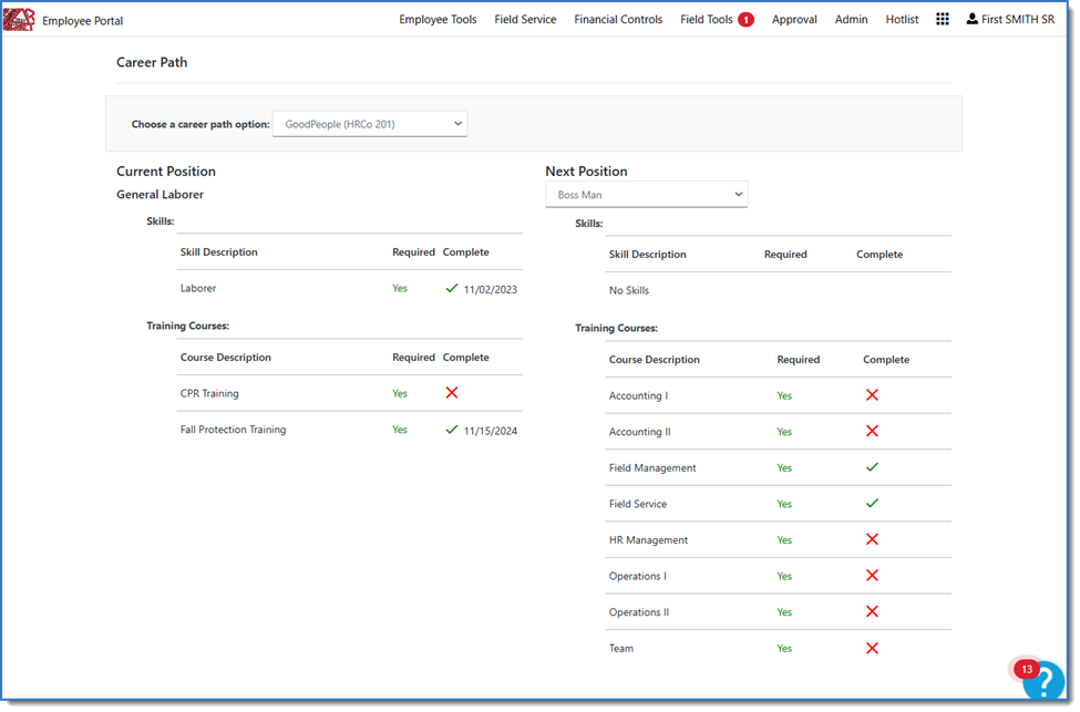 Career Path feature in their Employee Portal. This intuitive tool allows them to explore their potential growth opportunities and see the exact skills and training required to reach their next position: